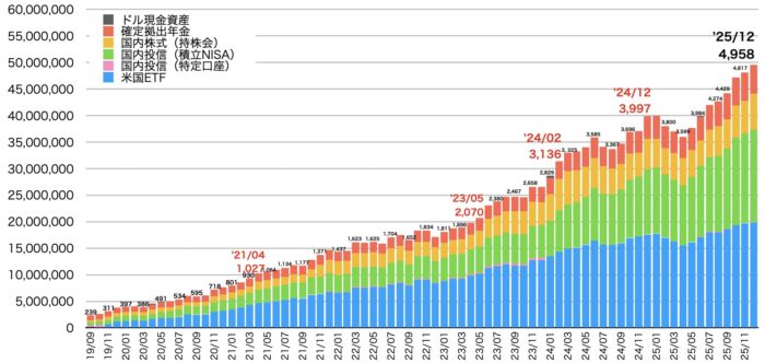 2025年として振り返ると24年末から約1,000万円増加していますね。資産運用としては十分な成績だと思います。これ以上は高望みでしょう。25%増加ですしね。