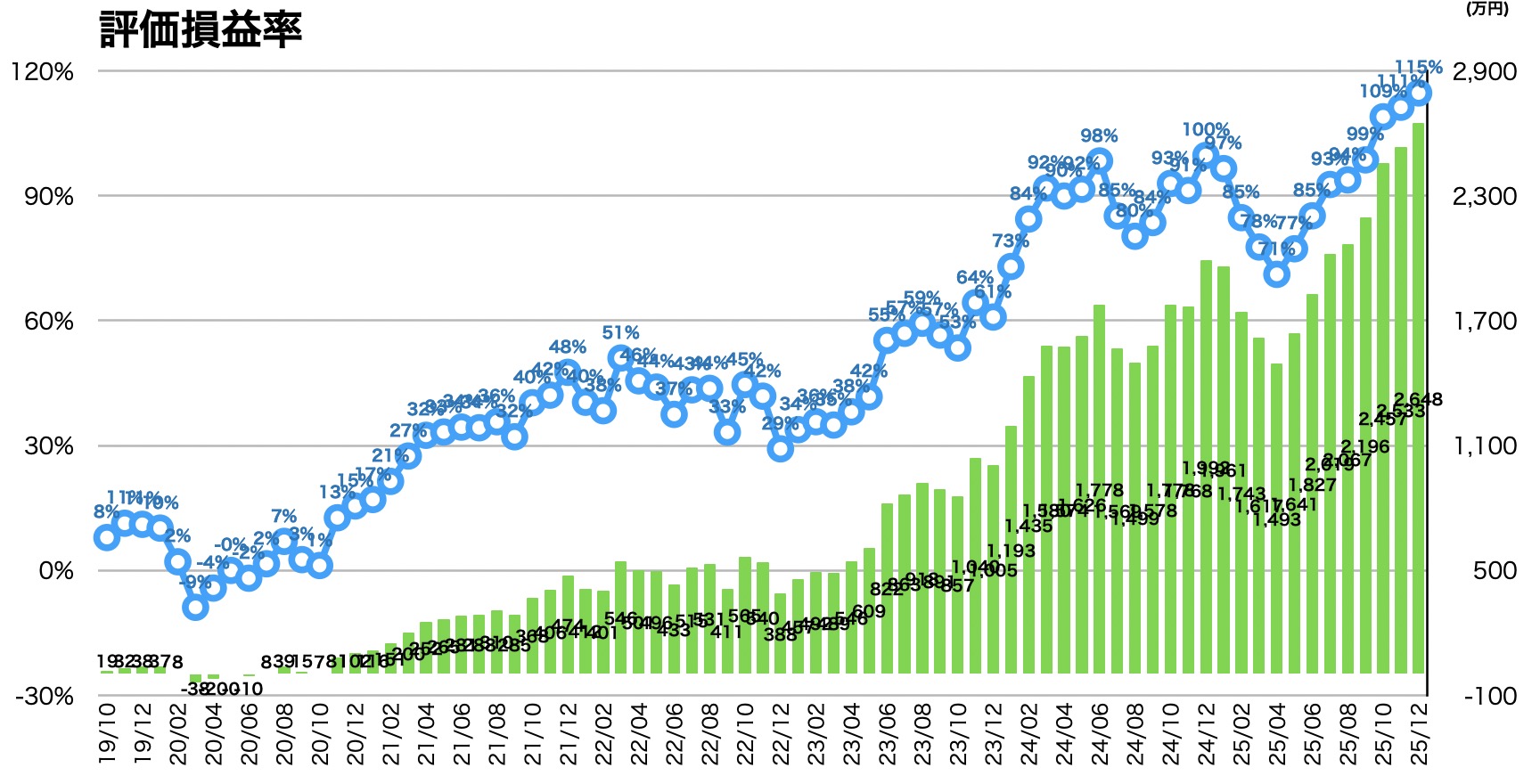 2025年も好調な相場に支えられて大きく増えました。含み益は幻ですが、650万円という数字は3,40代の平均年収超えてますからね〜