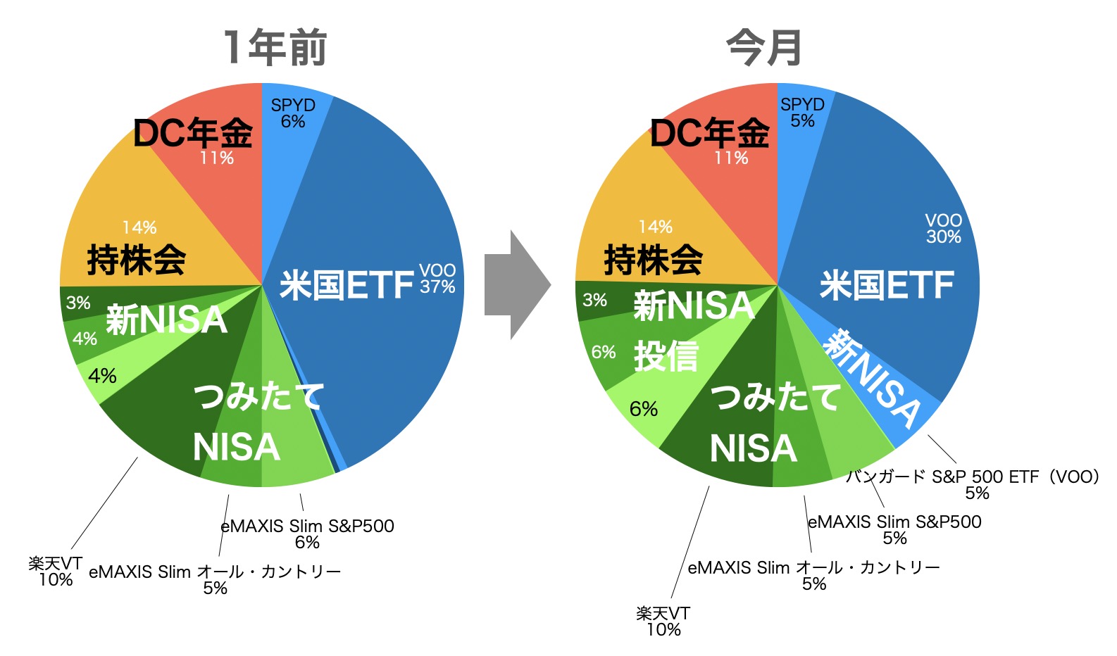 今回は1年前と比較しています。新NISA投信部分が少し増えましたね。1円も入金してないはずのSPYDの比率が意外と落ちないのが不思議です😅全体の資産に対して入金の効果がなくなってきたという事なんでしょうか
