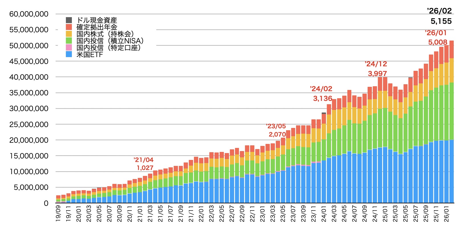 今月も無事に増加していますね。改めてグラフを見返すと2,000万円を過ぎてからは毎年1,000万円増えてますね。市場が好調なだけとは言え、私がもう1人いて市場で頑張ってくれているような話です。5000万円スタートだと市場が14%伸びてくれたら入金も合わせて6,000万円に到達できる計算です。ちょっと楽観過ぎますね😅